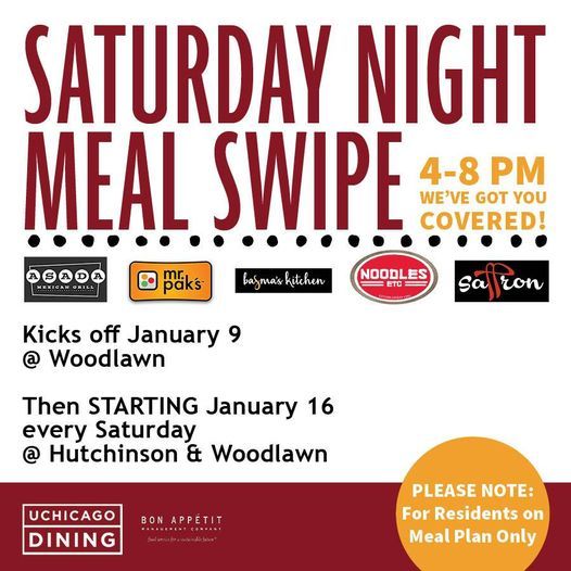 Saturday night meal swipes will be redeemable only at hutchinson commons between 4:30 and 7:30 p.m.